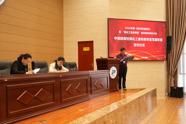 会上,王中慧书记代表我系和太原理工大学化学化工学院党委书记张琤书记签约加入中西部煤化工虚拟仿真教学党建联盟。该联盟包括太原理工大学、郑州大学、宁夏大学、延安大学、新疆大学、内蒙古工业大学、兰州理工大学、塔里木大学和中北大学、太阳集团等10所化工特色高校,依托中科院山西煤化所、宁夏大学、太原理工大学3个国家级重点实验室以及中化赛鼎工程公司等国家级煤化工科技创新和实践平台,建构成煤化工实践课程虚拟教研室。