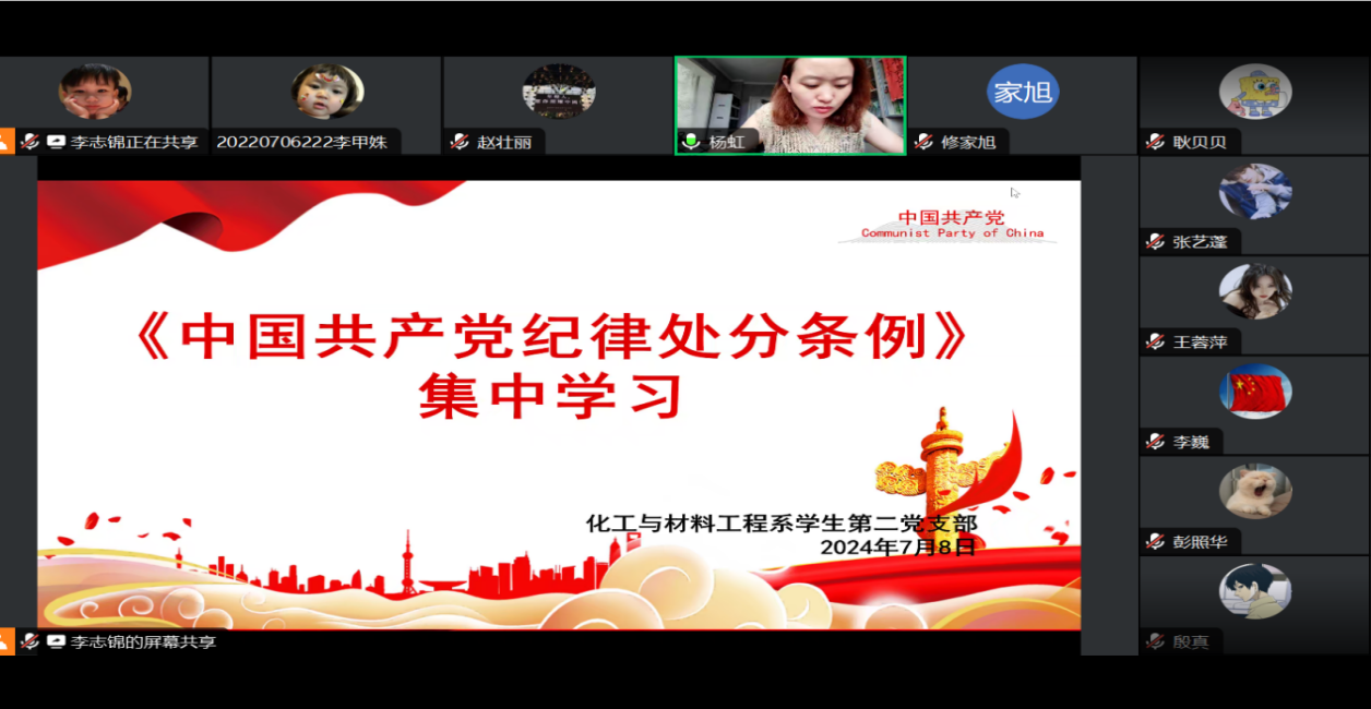 为加强对党员的教育管理,继续深入学习贯彻《中国共产党纪律处分条例》,推动支部全体党员自觉学纪、准确知纪、心中明纪、严格守纪,进一步增强党纪学习教育质量与成效,促进党员在工作和生活中严格遵守党的纪律和规矩。特此,我系学生第二党支部于2024年7月8日下午15:00在线上开展了以“中国共产党纪律处分条例”为主题的集中学习。本次会议由支部书记杨虹主持,参与本次会议的有太阳集团tyc138学生第二党支部全体党员。