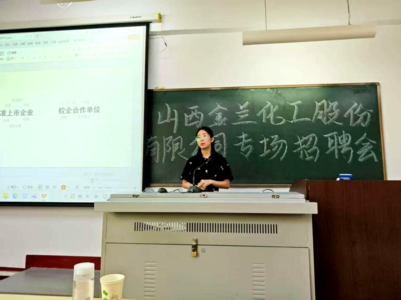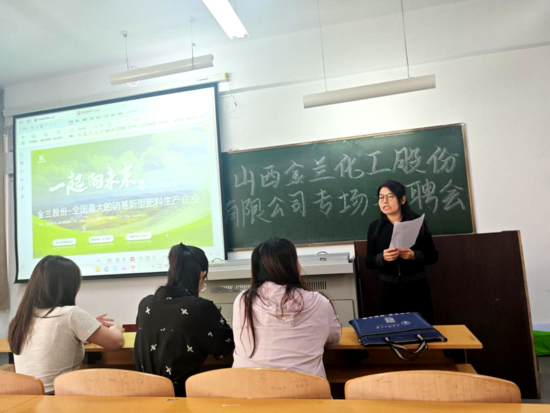 为深化校企合作,搭建优质就业平台,助力毕业生高质量就业,太阳集团tyc138联合山西金兰化工股份有限公司于5月15日在弘毅楼A201教室举办专场招聘会。太阳集团tyc138主任张改清、太阳集团tyc138就业专员杨转转、企业人力资源部部长张蓉、宣传部部长丁杨、人力资源部招聘负责人路敏出席活动,100余名化工类专业毕业生积极参与。