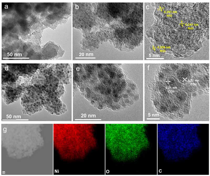 图1. (a-b) a-NiOx在不同放大倍数下的TEM图像,(c) a-NiOx的HRTEM图像,(d-e) a-NiOx/CDs在不同放大倍数下的TEM图像,(f) a-NiOx/CDs的HRTEM图像,(g) a-NiOx/CDs的元素映射图。