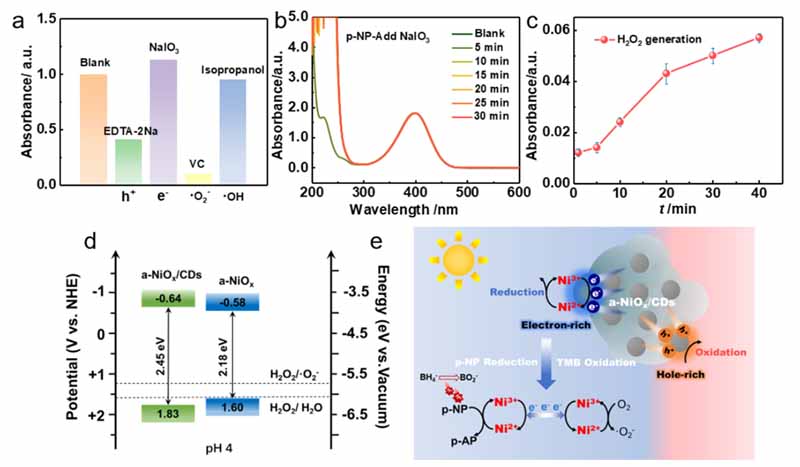图2. a-NiOx/CDs在(a) TMB光催化氧化反应和(b) p-NP光催化还原反应中的牺牲剂实验结果,(c) a-NiOx/CDs在pH 4下的H2O2生成性能,(d) a-NiOx/CDs和a-NiOx的能带结构,(e)催化机理示意图。