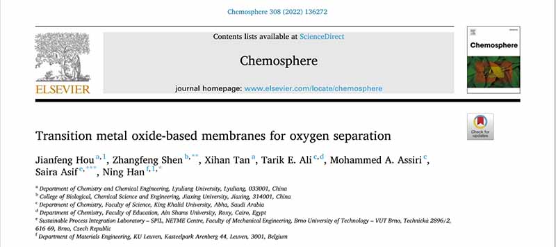 近日,我系侯剑峰博士撰写了运用于氧气分离的金属氧化物基膜论文一篇,研究论文以 “Transition metal oxide-based membranes for oxygen separation”为题发表于国际气体分离净化领域权威期刊《Chemosphere》 (中科院分区二区Top期刊,影响因子:8.943,DOI:10.1016/j.chemosphere.2022.136272) 。