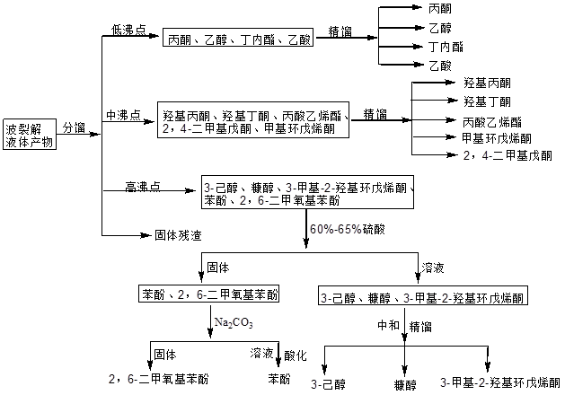 液体的主要成分为液态的醇、酚、羧酸、酮和酯,可以直接作为液体燃料使用,也可以进行有效分离,分离出有价值的乙醇、乙酸、丙酮、羟基丙酮和苯酚等作为化工原料。